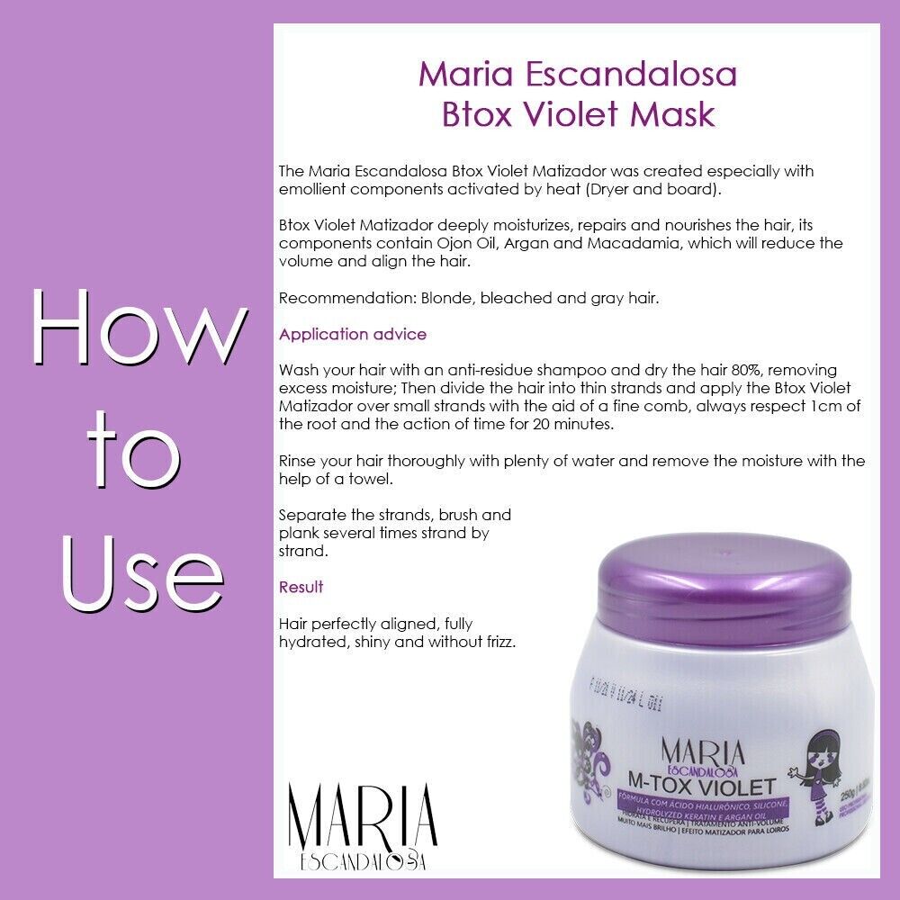 B-tox Violet Matizador hidrata, repara y nutre profundamente el cabello, sus componentes contienen Aceite de Ojón, Argán y Macadamia, que reducirán el volumen y alinearán el cabello.Recomendación:
